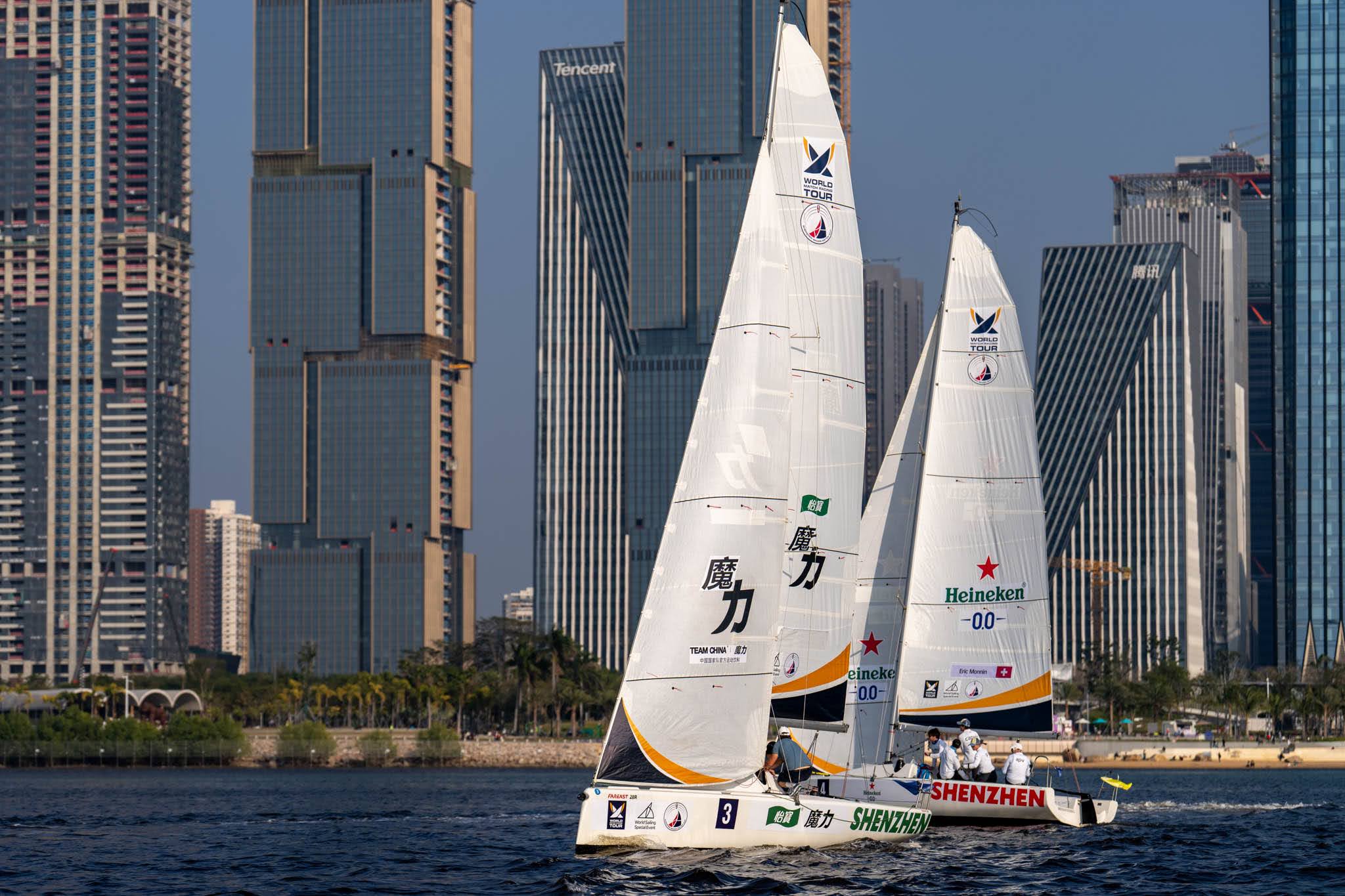 In the second qualifying group, five teams ended the day levelled on two wins from three races, including current womenโs match racing world champion Franceโs Pauline Courtois and her Match in Pink Normandy Elite Team competing in Shenzhen for the first time.